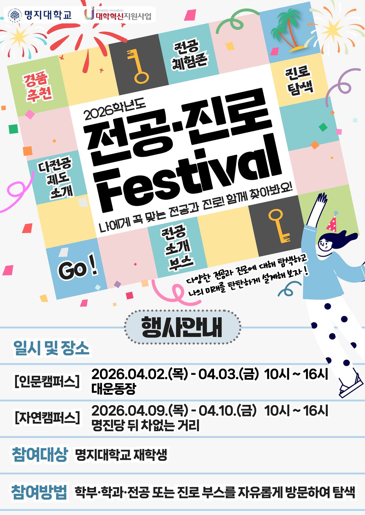- 자연캠퍼스: 2026. 4. 9.(목)~4. 10.(금) 10:00~16:00, 명진당 뒤 차없는 거리